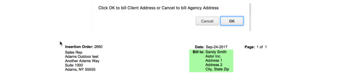 An additional prompt will display if the billing parameter for the client and items combination is Commission Only, Commission Only % of Net or Supplier Bills Client. This prompt will allow you to choose whether the client (default) or agency address should print as the 'Bill To' on the corresponding media order.