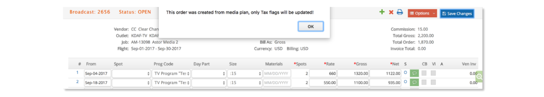 If the user selects OK, another pop up window will be presented asking to “Change Status to OPEN?” Click OK to change the Media Order status from REQ to OPEN. Otherwise, click Cancel.