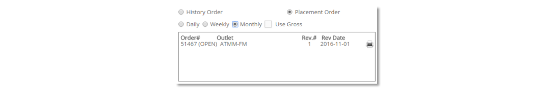 From within a media plan that has generated media orders, the use may also review and print the media orders by returning to the blue printer icon and from the pop-up printing window, select daily, weekly or monthly format and click on the printer icon as shown below.
