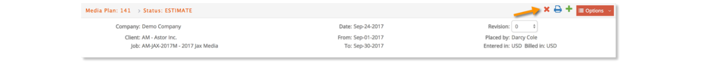 Media Plans with a status of ESTIMATE can be deleted. To do so, select the Media Plan you want to delete and click the