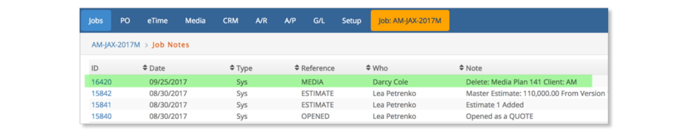 The Media Plan will be deleted and a note will be added to the job's Communication – Job Notes window documenting that a plan was deleted.