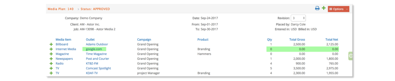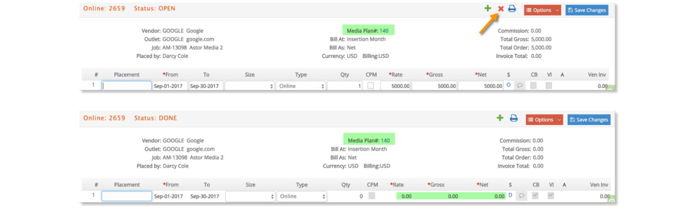 The user has the ability to delete a media Order that was generated from a media plan. When an order with a REQ or OPEN status is deleted, then media plan lines will be automatically updated by e·silentpartner both in the Media Order and the Media Plan.