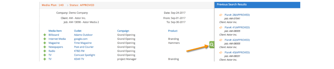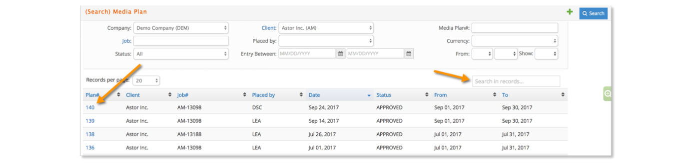 The user will have the ability to search for all media plans by Company, Client, Media Plan #, Job, Placed by, Currency, Status, Entry Between date range, or Planned date.