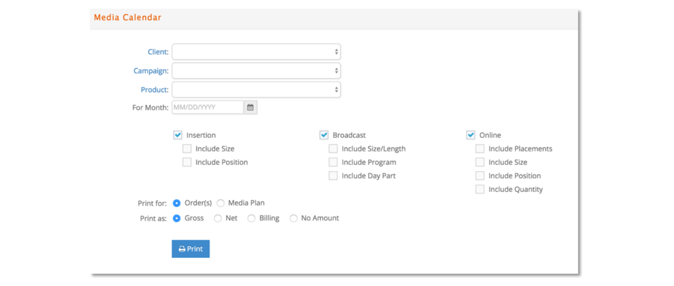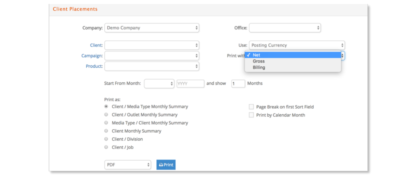 Generate using Net, Gross or Billing amounts. By default, broadcast placements display based on the broadcast calendar, however, the report may optionally generate based on calendar month instead.