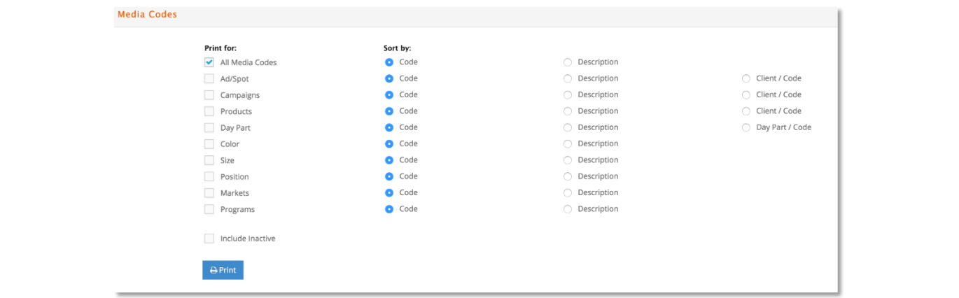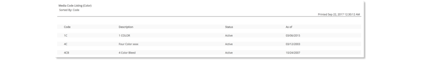 This provides and on-screen report of all or selected media codes including code, description, active status and ‘as of’ date.