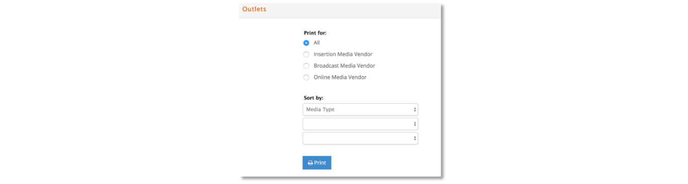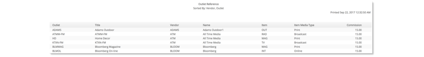 This provides and on-screen report of all vendors or a subset by Insertion, Broadcast, or Online media vendors. The report displays outlet code and name, item, vendor code and name, and media type.