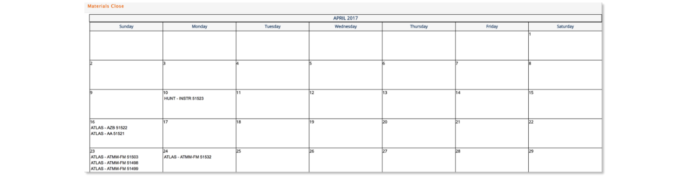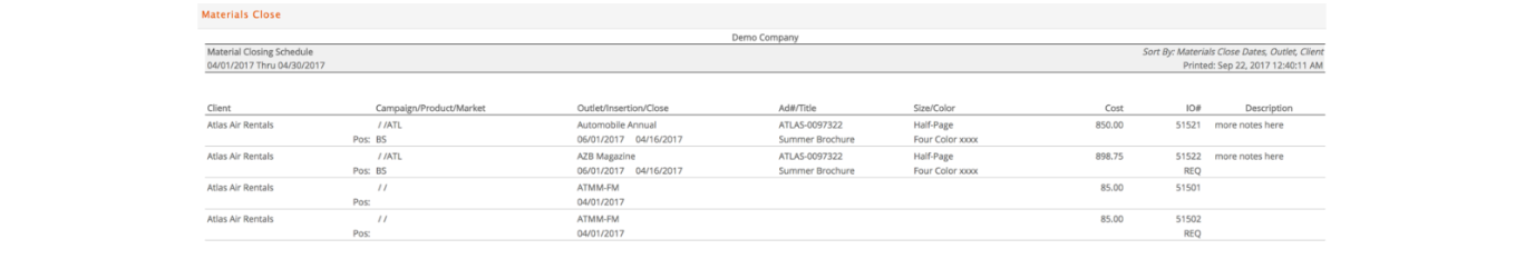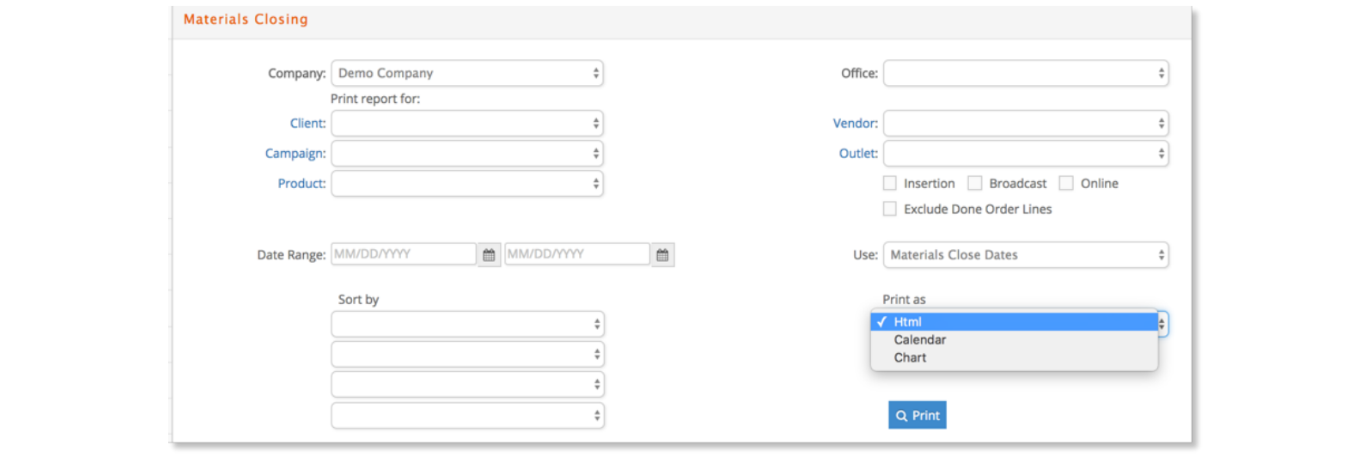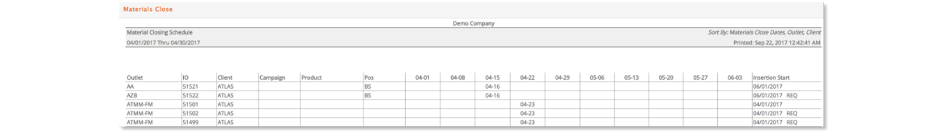 This provides and on-screen report in HTML, Calendar, or Chart format of materials or space close dates for insertion, broadcast, and/or online orders. Select for a date range for selected or all clients, campaigns, products and pub/stations.