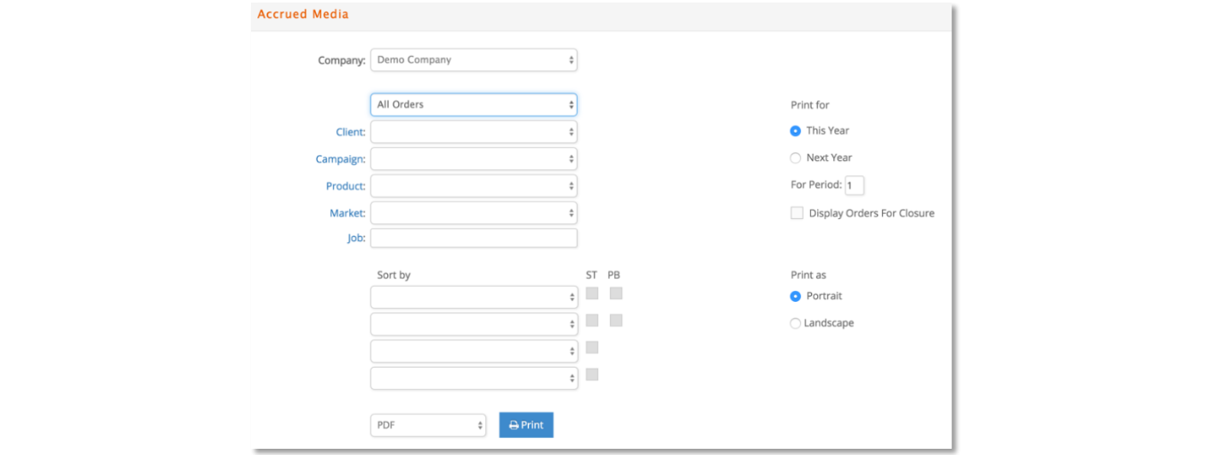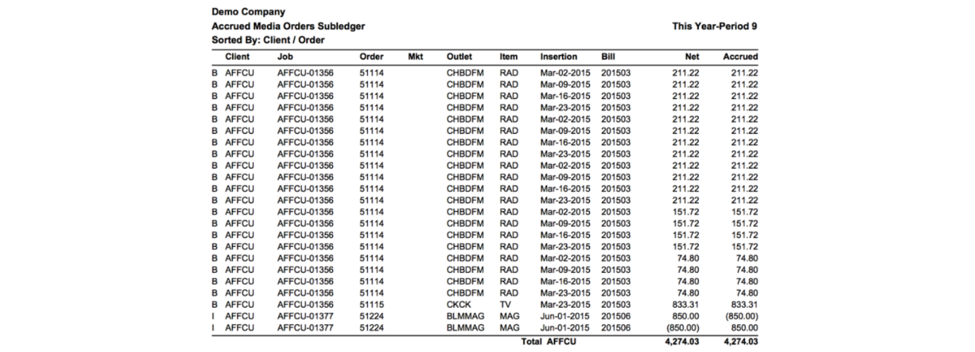 The Accrued Media report generates based upon the fiscal period sub-ledger for this year or next year. This report ties to the Accrued Media account(s) on the balance sheet and should be verified at least monthly to ensure all is in balance.