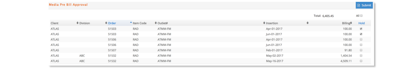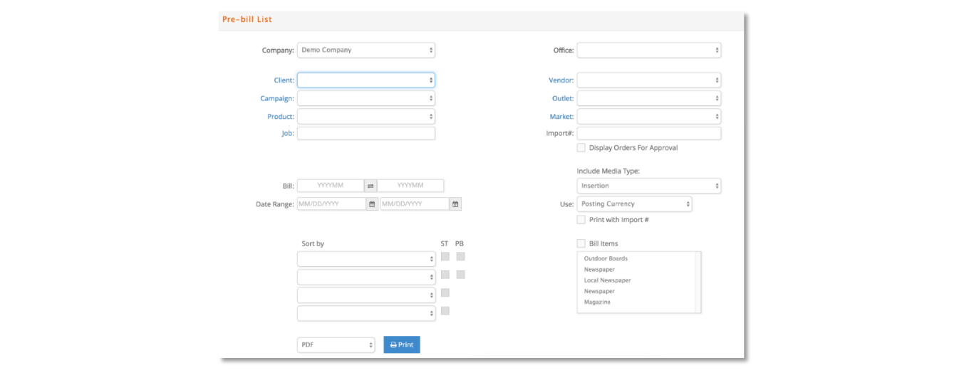 The Pre-bill List generates a report to show all media orders not yet billed based upon billing months or a date range. It is recommended this report be run frequently prior to billing media.