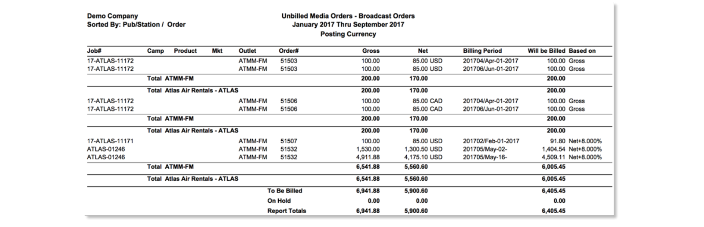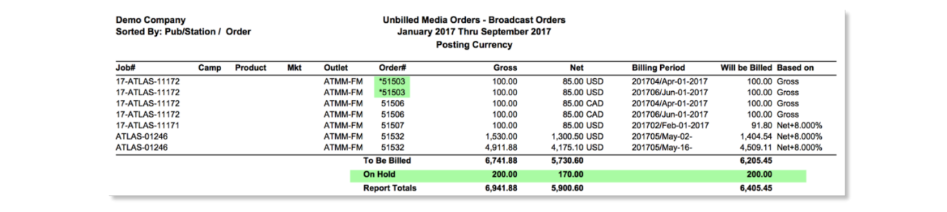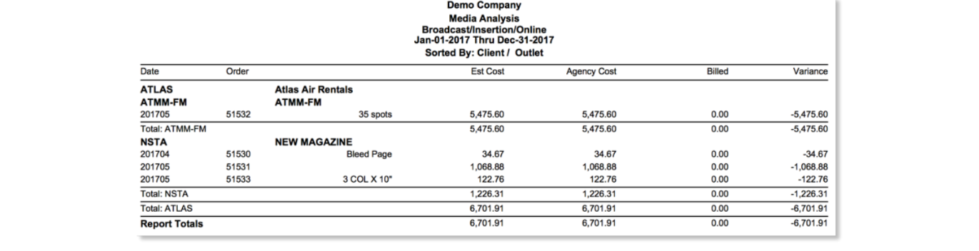 Media order lines will appear on this report if they were billed to the client but not vendor invoiced in total. Also, if they were invoiced from the vendor but not yet billed to the client.