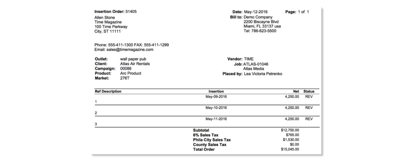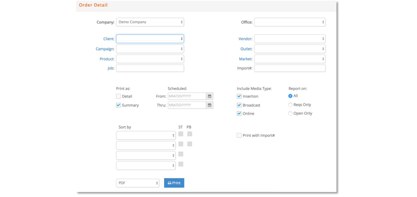 The Order Detail report generates a view of line-by-line media order details using the various criteria such as client, vendors, media type, etc. Print as Summary or Detail and optionally with Strata Import #.