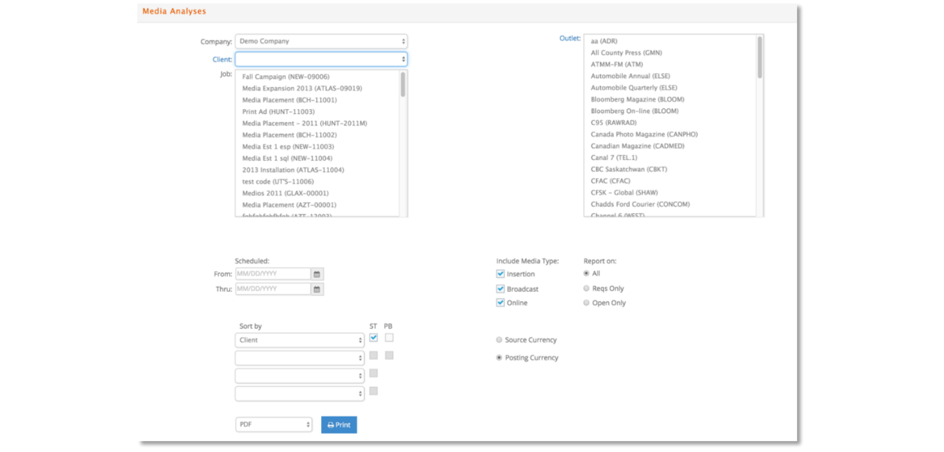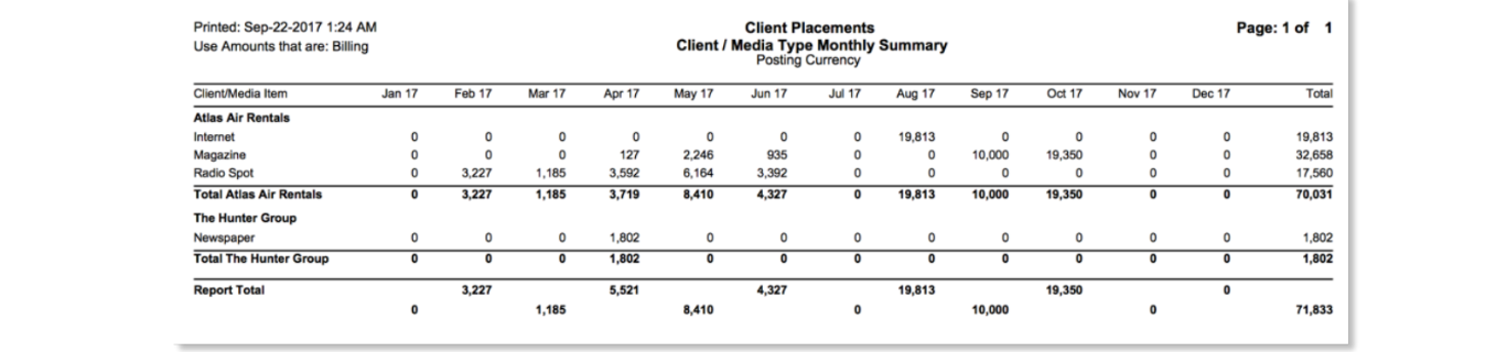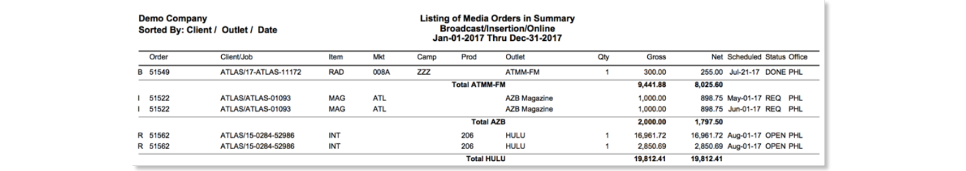 Subtotal by client/media item, client/outlet, media item/client, client only, client/division, or client/job.