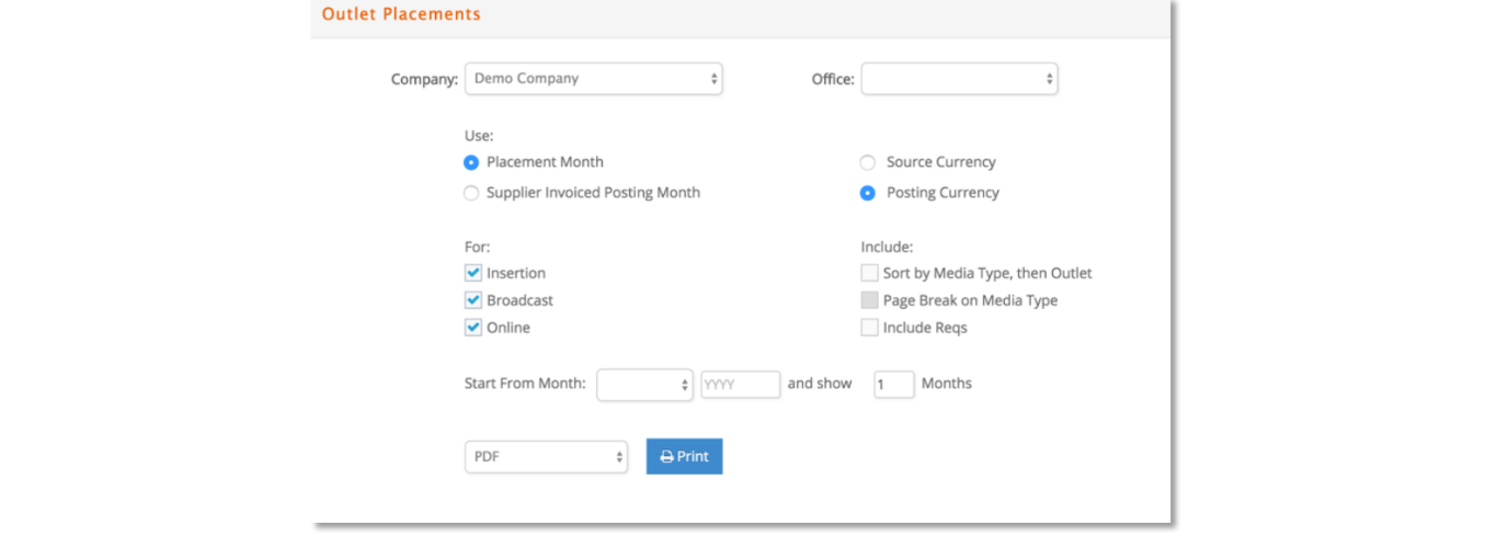 Sort by Outlet only or by Media Type first and generate based on Placement Month or Supplier Invoiced Posting Month.