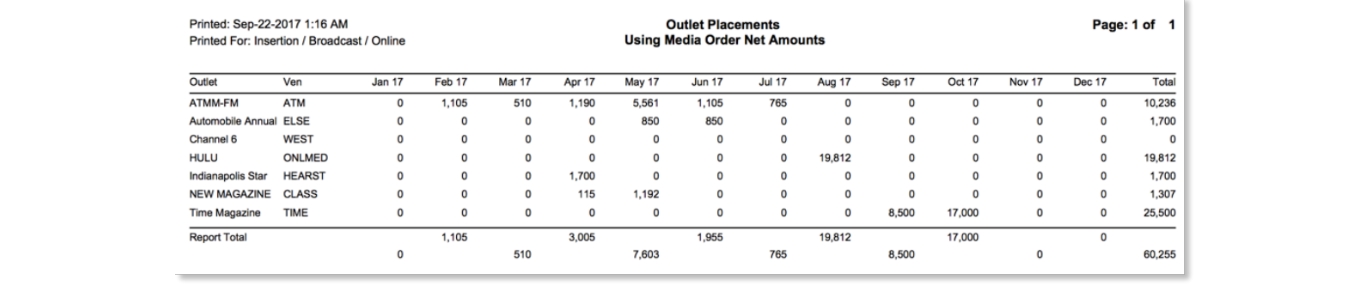 The Outlet Placements generates a report for placements subtotaled by outlet. It displays one column per month starting with the month, year and number of months entered in the report selection window.