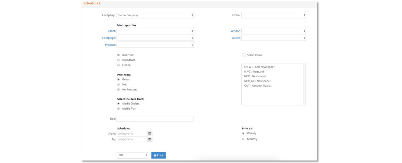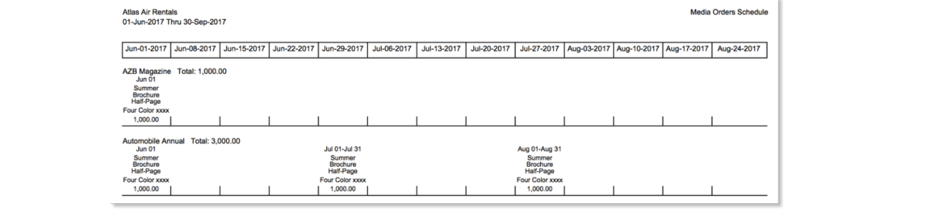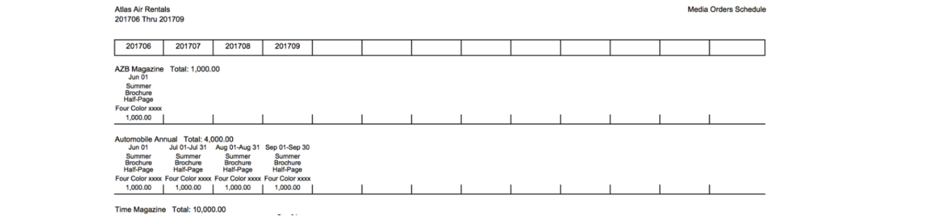 The Schedules report generates to view media schedules in a spreadsheet-like format that summarizes by week or month. Print with order or media plans for insertion, broadcast or online.