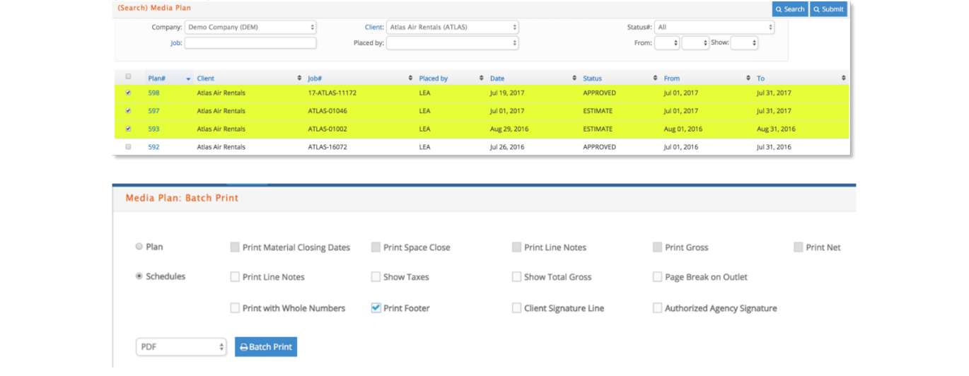 Use the batch plan printing reporting window to filter and search for media plans which are then selected and submitted for batch printing as Plans or Schedules. Click on the blue plan # to go view the plan.