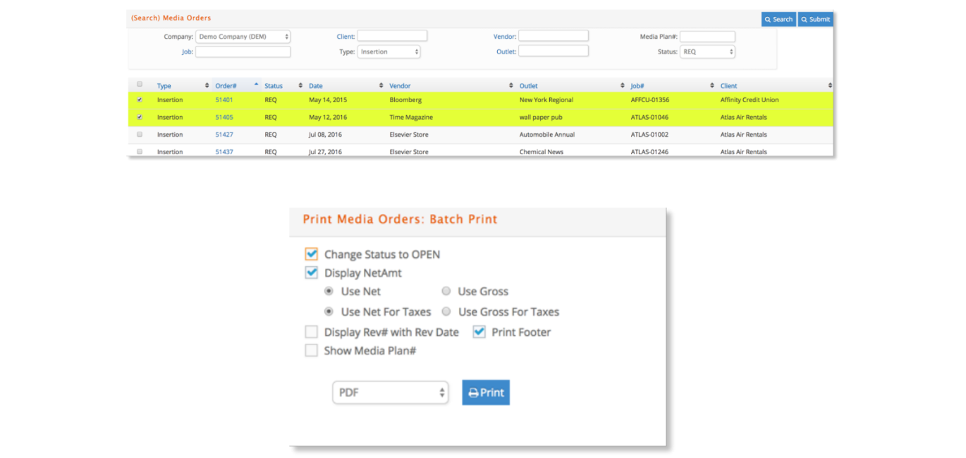 Use the batch order reporting window to filter and search for media order which are then selected and submitted for batch printing and optional approval. Click on an order # to view the order.
