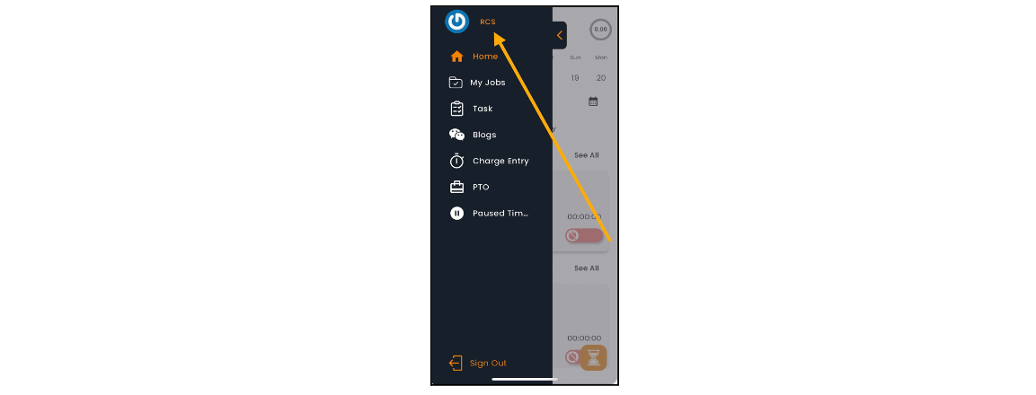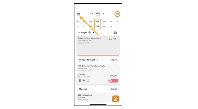 Click on the three bars on the top left corner of the home screen to open the navigation menu. Here, you’ll see the menu with your Profile Name, Home, My Jobs, Task, Blogs, Charges Entry, PTO, Paused Time Entries and Sign Out. The sections below will assist you in navigating each of these features.