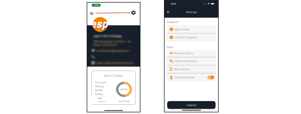Tap the profile name icon to view your account information with your name, database name, email, cell phone and e·slientpartner URL.