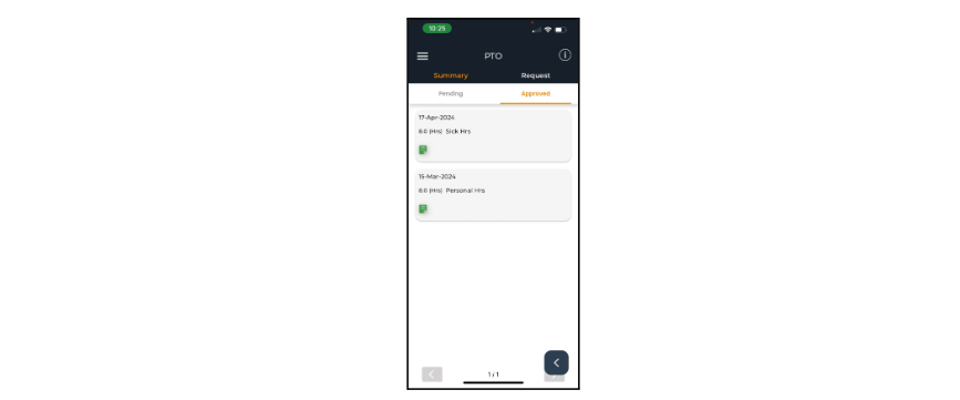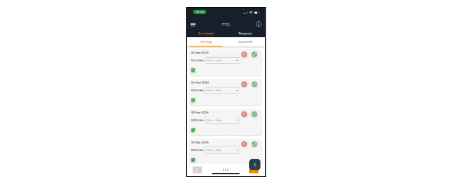 You can see all of your pending PTO Requests here. If you need to change the PTO type, tap the drop-down to scroll down. You can tap the notes icon to review your notes. To delete a pending request, tap the red X. To save any changes made, tap the green check mark.
