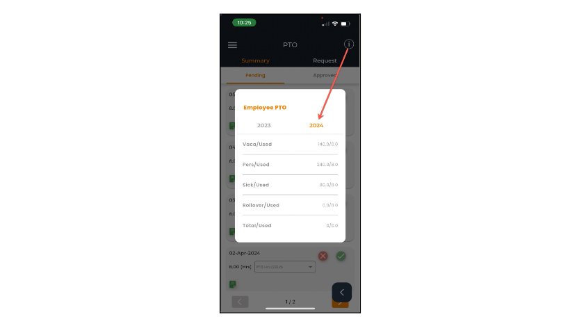 Tap the i icon on the top right corner to open your Annual PTO recap. This window allows you to view all of your available versus used PTO time for years currently active in your database.