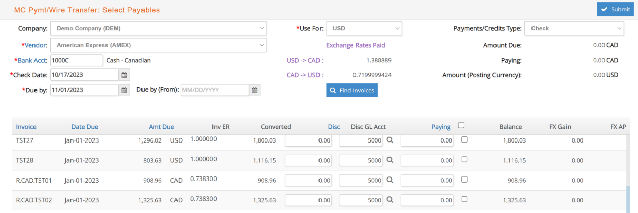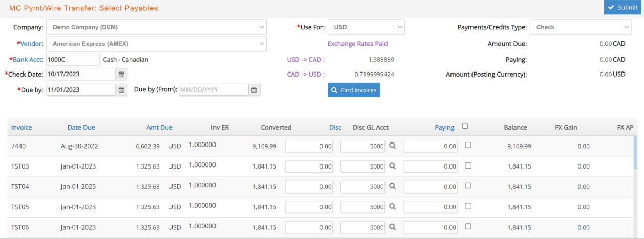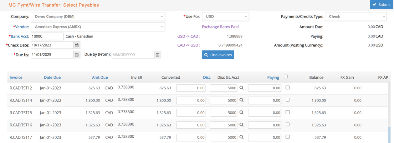 In the above example, all invoices for the vendor, American Express, were originally posted in USD. However, you want to issue the payment in CAD.