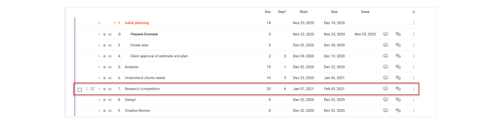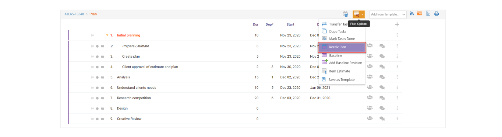 Sometimes it can get disorganized when you are making many changes to a plan; if you switch dependencies or orders of tasks, the start dates will not update automatically. We use the “Recalculate Plan” option to calculate the start dates based on the dependencies and order of tasks set.
