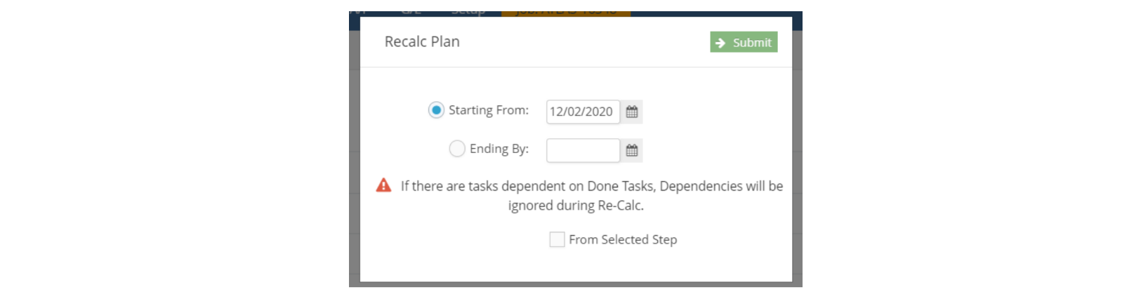 - From the pop-up window that displays, select within which dates you want the plan to be recalculated. You can also select to recalculate from the selected step in your plan. Then click Submit: