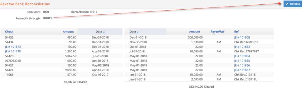 To reverse a Bank Reconciliation, go to the Reverse Reconciliation option in the AP menu, enter a ‘Bank Acct.’ and the ‘Reconcile through’ date and tab out.