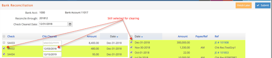 Once the reconciliation window for the period is opened again, any transactions previously reconciled are still selected to be cleared along with any previously specified cleared dates. This essentially remembers the prior bank reconciliation so you can make the necessary changes and reconcile again.