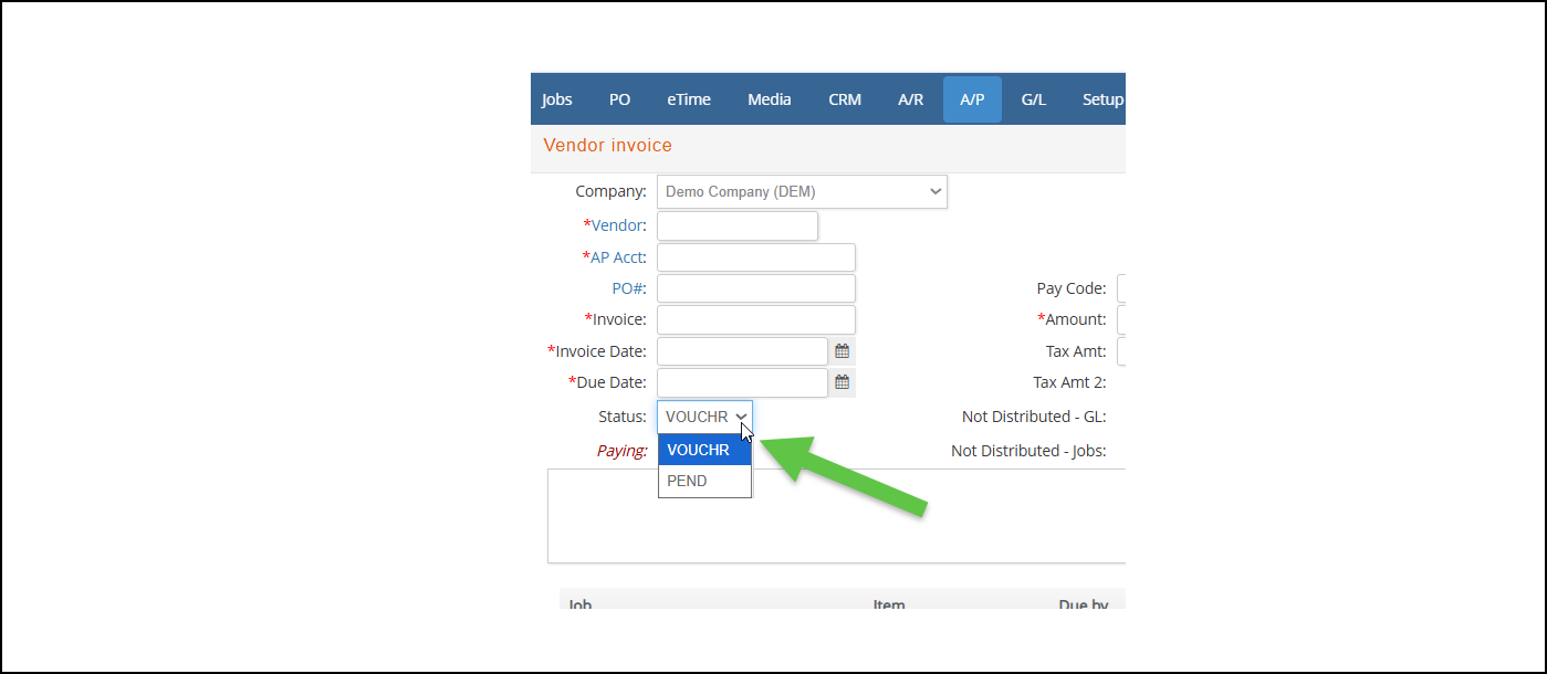 - If created as PEND - invoice is created with PEND status and additional fields become editable, including: Invoice Date, Status, Amount, Tax Amt / Tax Amt2, GL Distribution, and Job Distribution