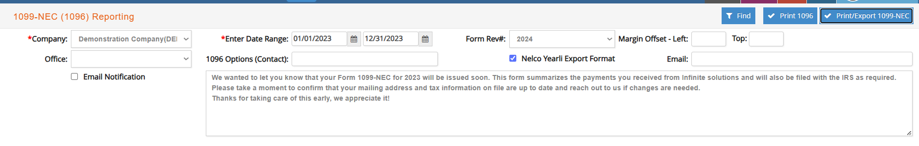 For those of our clients that would like to generate electronic 1099 forms, please, review our integration with Nelco/Yearli by using this link.