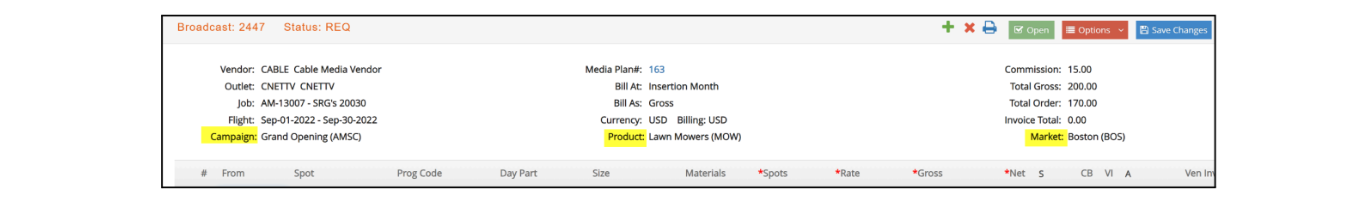 - Media > Media Order > Header: Campaign, Product and Market are now visible when showing Broadcast Media Order lines.