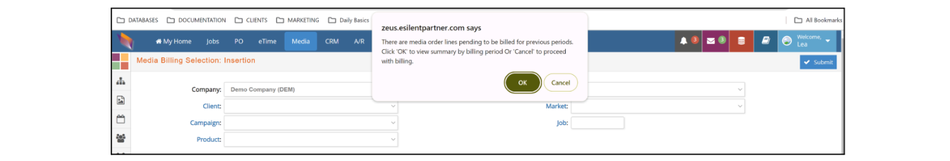 - Media > Billing > Insertion/Broadcast/Online: a new alert has been added when billing media orders if there are any media order lines pending to be billed for previous periods. Click ‘Ok’ if you would like to view a summary of the lines pending to be billed.