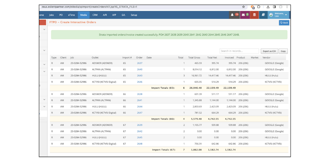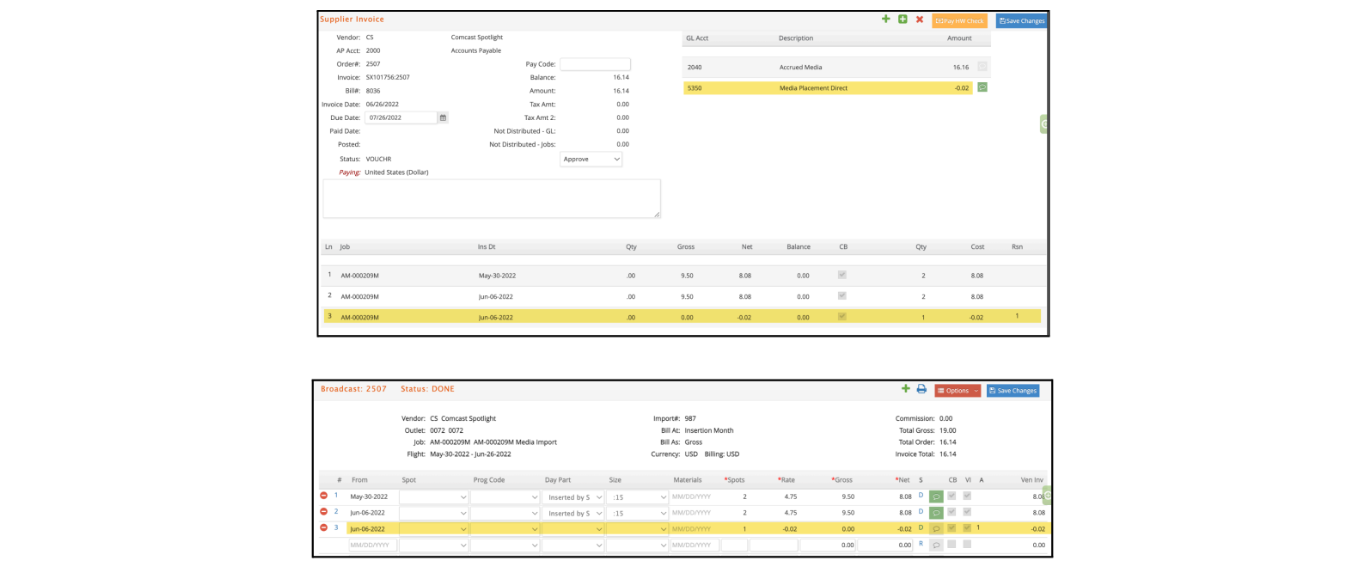 Once the import is complete, each supplier invoice will reflect the write-off amount adjusted to the net GL account assigned to the media item associated with the outlet. Additionally, a write-off line with Reason 1 is added to each media order for one of the placement weeks included in the order.