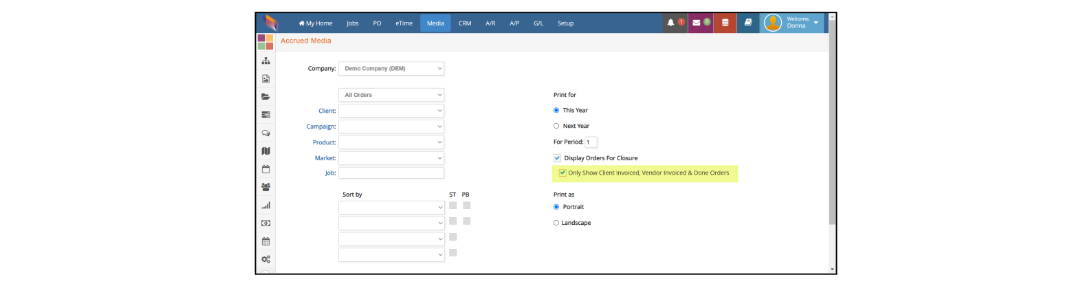 - A new control is added when using the “Display Orders for Closure” window to clear media lines. Any lines with unposted media client or supplier invoices cannot be selected for closure until the associated invoices are posted.
