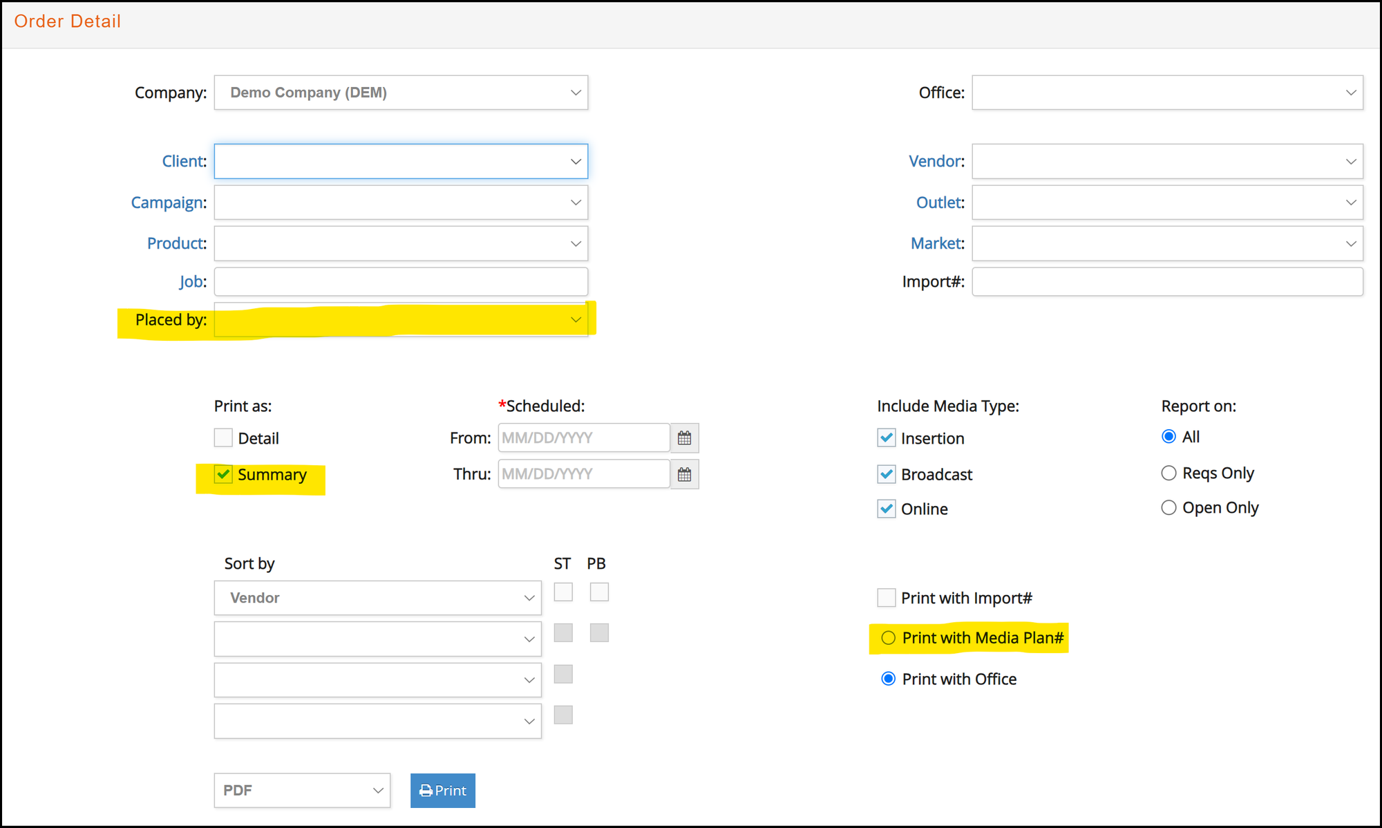 Additionally, 'Placed by' field will allow this report to print information based on the user that placed the Media order.