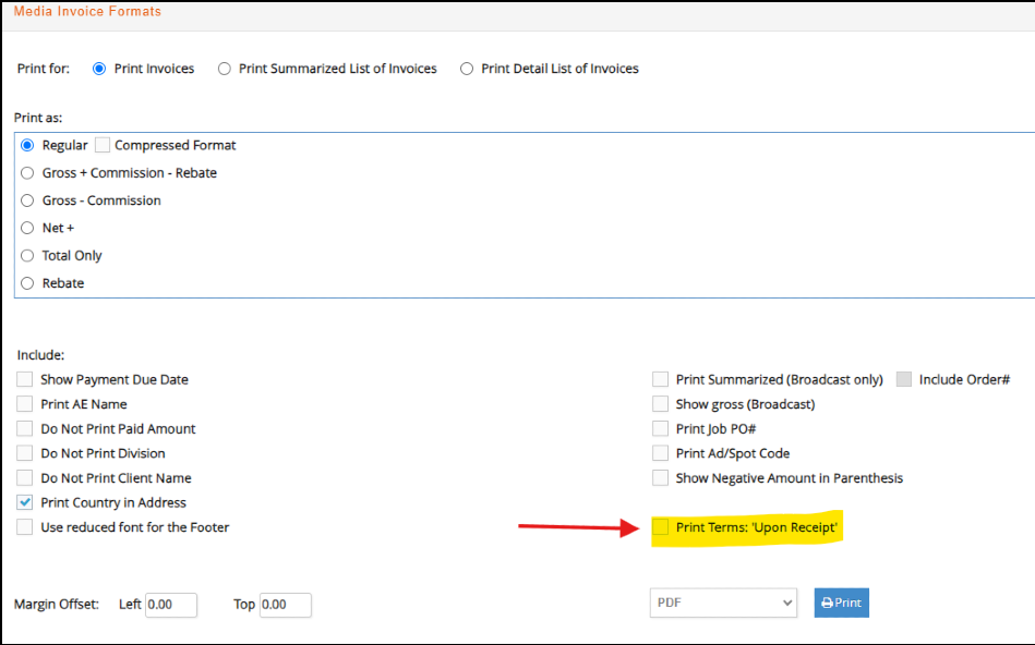 - Media> Billing > Print Invoices: Additional option to print terms as 'Upon Receipt' has been added. If selected, any existing Terms set for said client will be overwritten