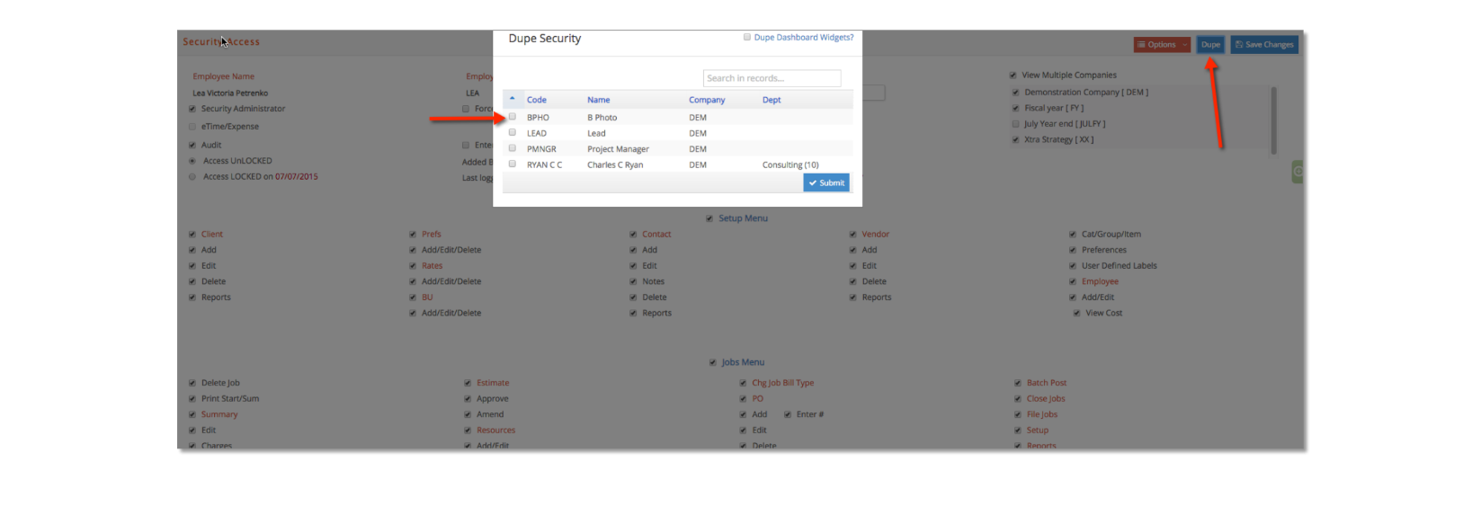 To speed the setup of security records, selecting the blue ‘Dupe’ button, at the top right of the security window, means you can duplicate the current security profile to another user and then edit it accordingly.