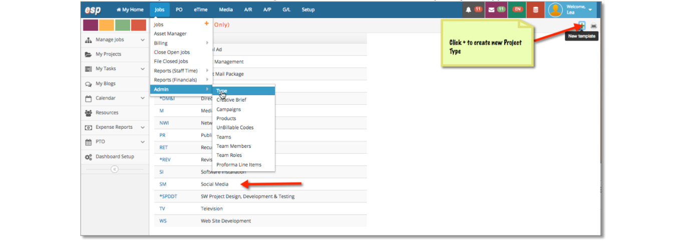 To add a new project type, navigate to Jobs > Admin > Type and click on the + in the upper right corner.