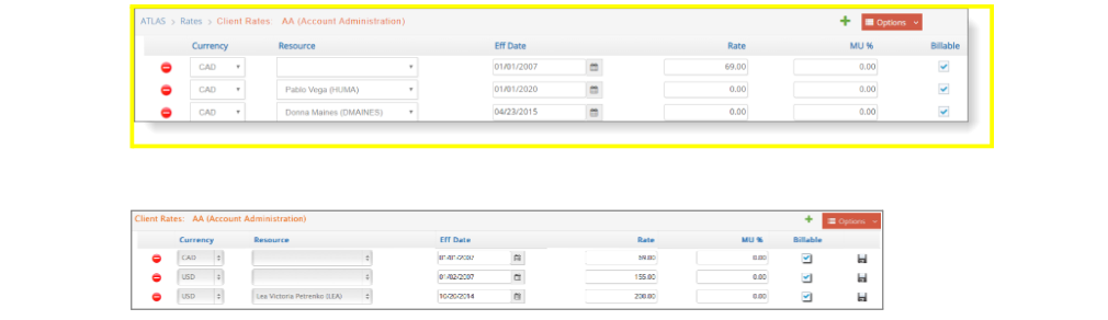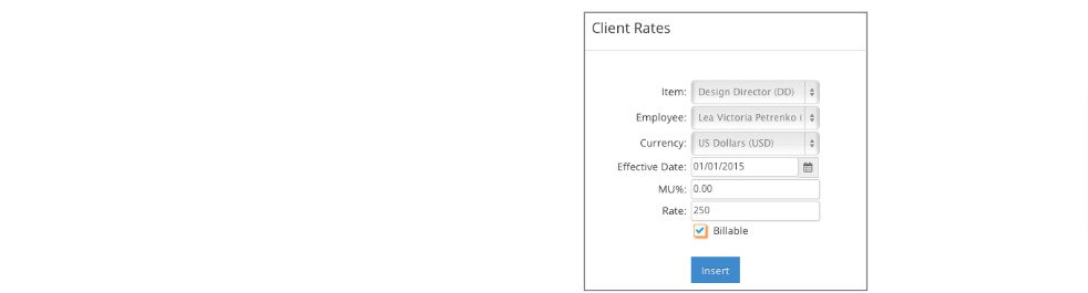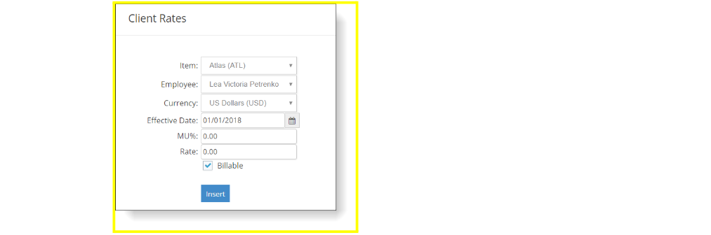 Client rates are directly linked to the client master record and are accessed by clicking Rates on the Options menu.