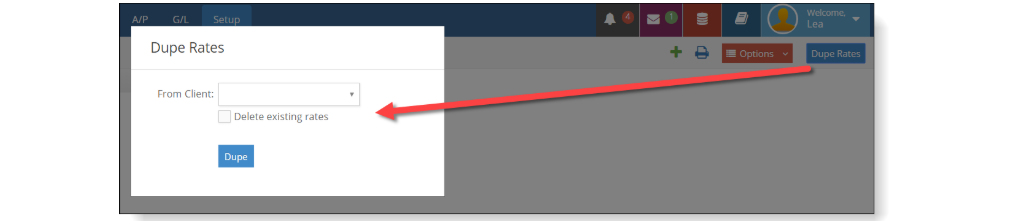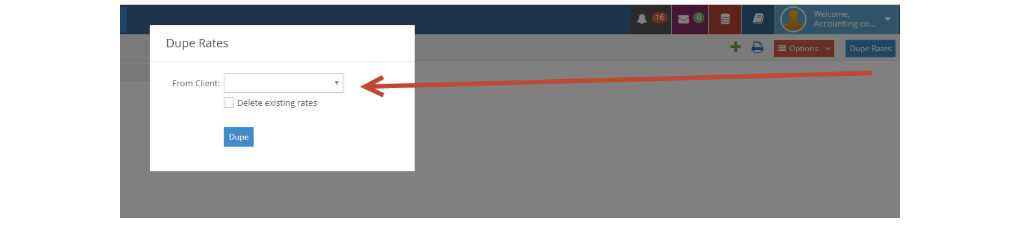 There is also an option to duplicate existing rates for a different client. If you have set up a group of rates and would like to use the same rates for a different client, please, click the Dupe Rates option on the top right side of the window. You will be given the option to import them and keep the existing rates in the ‘receiver’ client, or to delete them.