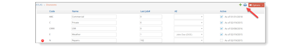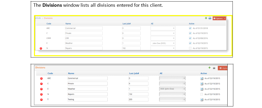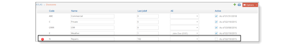 - A client division record cannot be deleted if that division is used anywhere else in the database. For example, if a job had been previously opened for that client division. If you no longer do business with this division and if a job or estimate is in your database for this division, then make the client division record inactive. Red delete icons will only show up in those records that are not used and can actually be deleted.