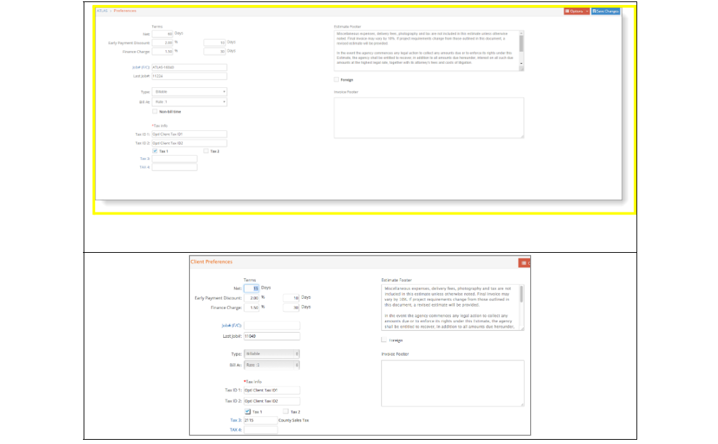 This section of e·silentpartner provides the capability to customize each client's individual preferences, including Terms, Tax Information, specific Estimate, Invoice Footer comments and the default Bill At rate. To define your client's requirements, click Preferences on the