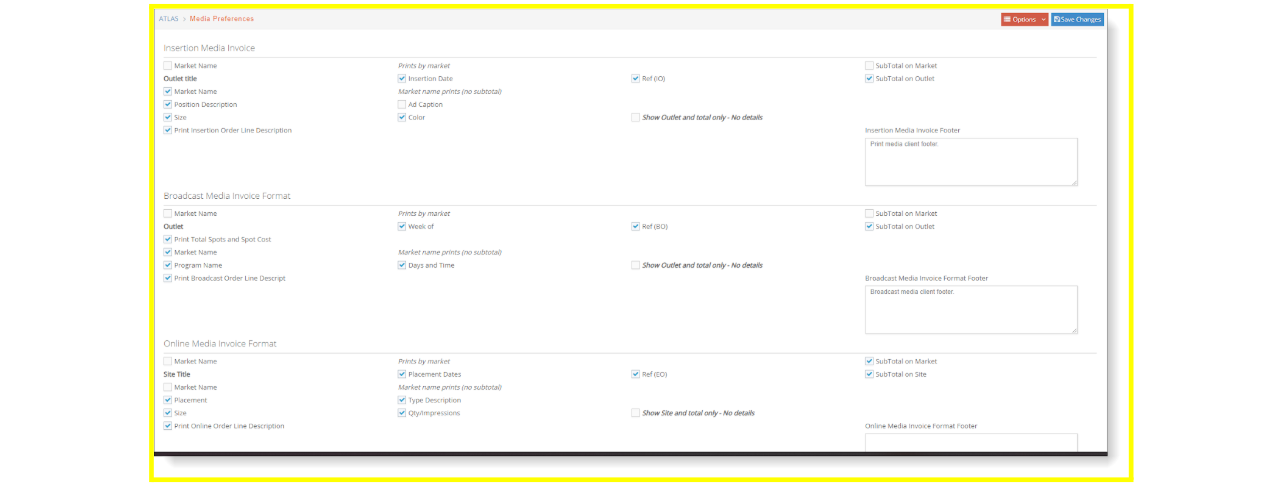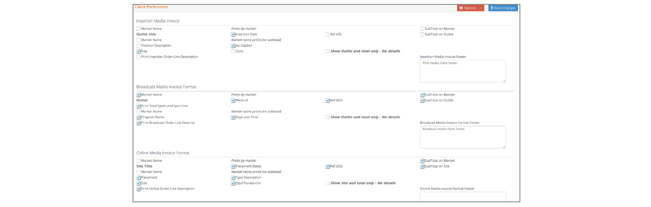 If you bill a client for media placement, this window allows you to define the default invoice format (what prints, what subtotals do you want, etc.) for each type of invoice: Print, Broadcast and Online.