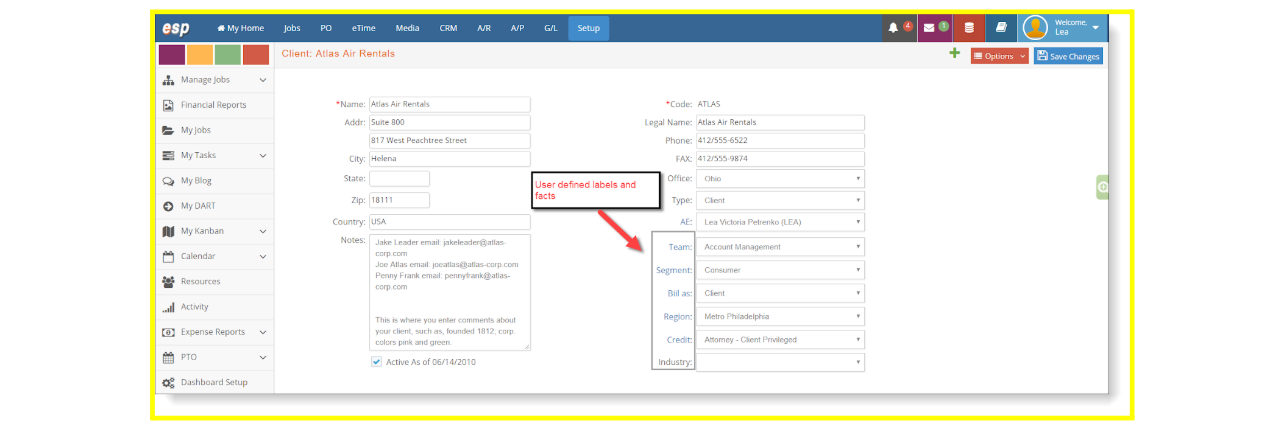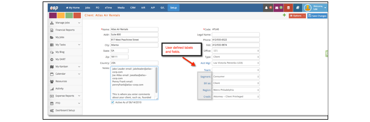 - User Defined Fields. There are four user-defined fields. To qualify your clients in any way you desire, you can define these four fields. As an example, you could define the fields as Segment, Bill as, Region, and Credit. The field names are defined in Setup > Preferences > Client Defined Fields.