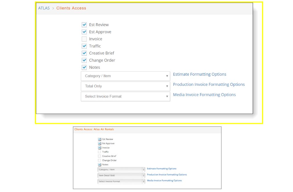 e·silentpartner provides a portal for client access to estimates, schedules, digital assets, etc. The purpose of this window is to define what your client can view. Using this feature, you also indicate the format of a project estimate and invoice the client will view when they select to display the content of both.