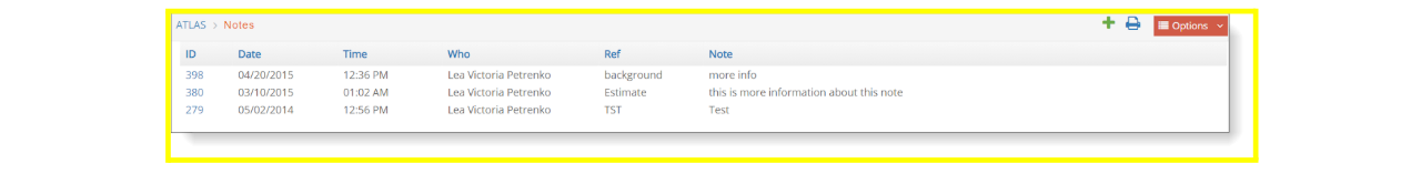‘Notes’ is the last selection under Options. Use this area, notes, to record information that you may want to refer to in the future. Select Notes to view a list of notes entered for this client.