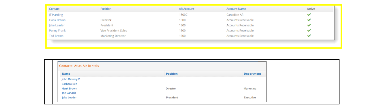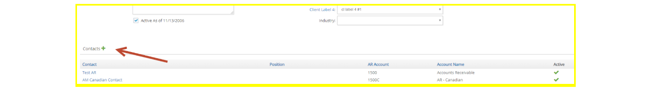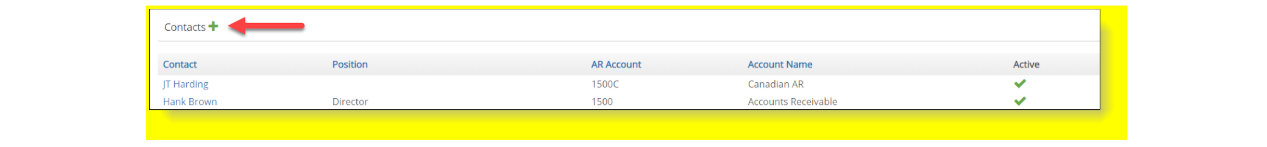 Click on any Contact Name to navigate to the contact window and view and/or change the information set up for the contact. You can also quickly add a new contact by clicking on the green plus icon by Contacts. View Contacts section for additional information on how to create a new contact.