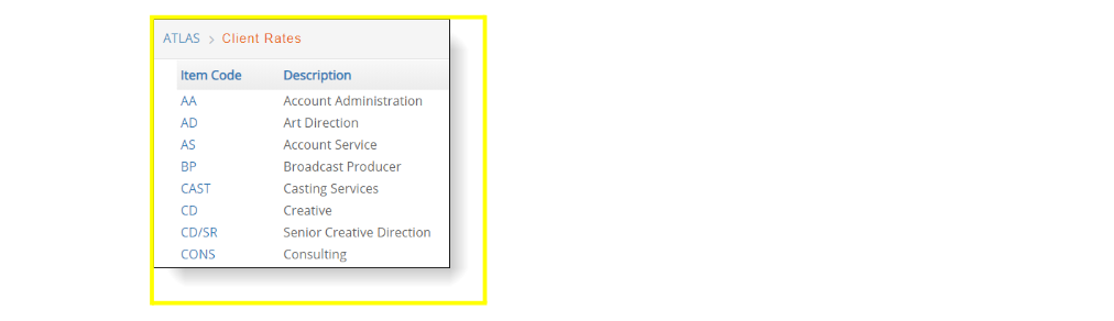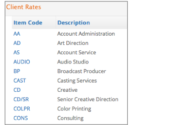 adding a new line to the client rate schedule, you must use an item code that was previously set up in your company list of materials and services. Refer to the Setup > Item section of this manual for additional information. -